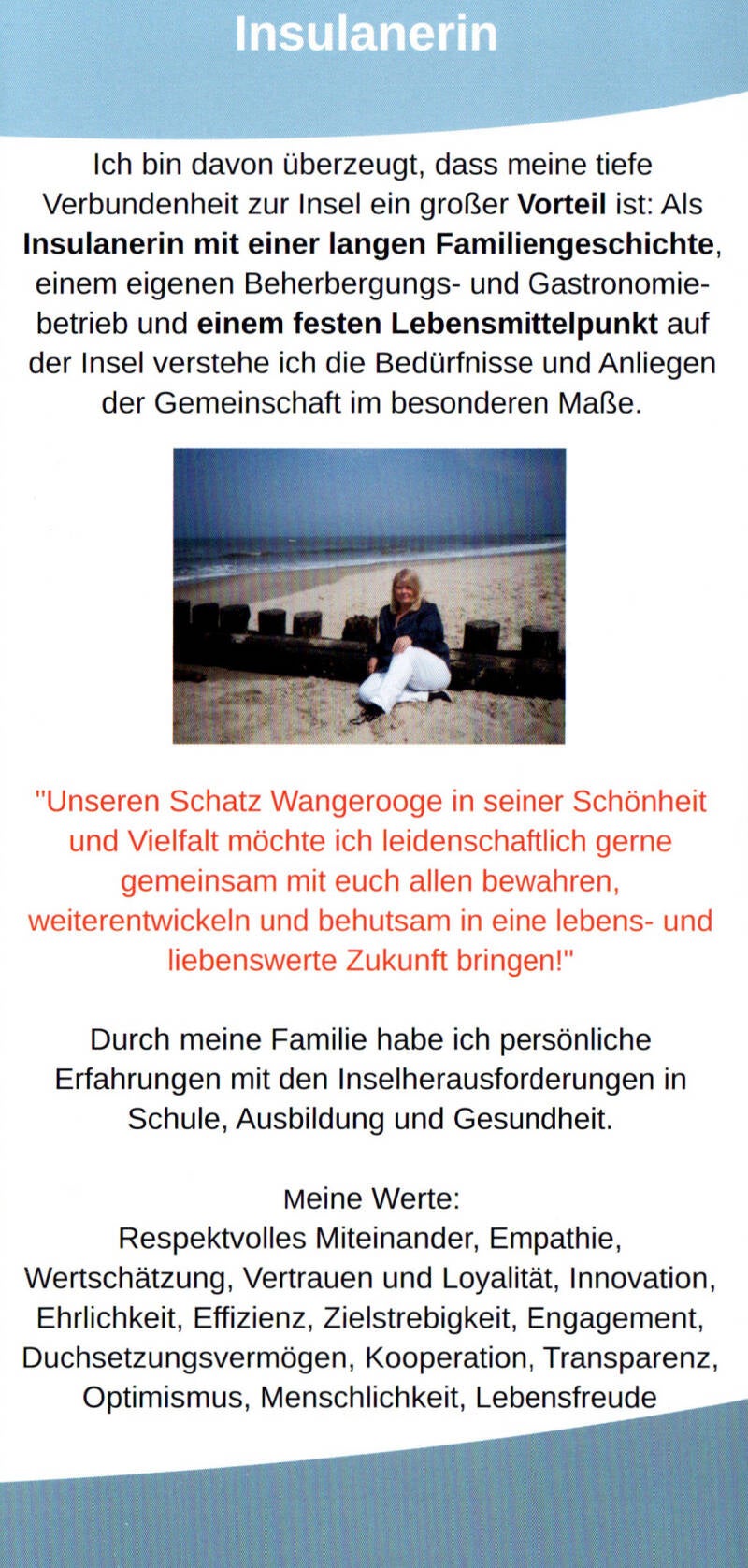 “Unseren Schatz Wangerooge in seiner Schönheit und Vielfalt möchte ich leidenschaftlich gerne gemeinsam mit euch allen bewahren, weiterentwickeln und behutsam in eine lebens- und liebenswerte Zukunft bringen!”